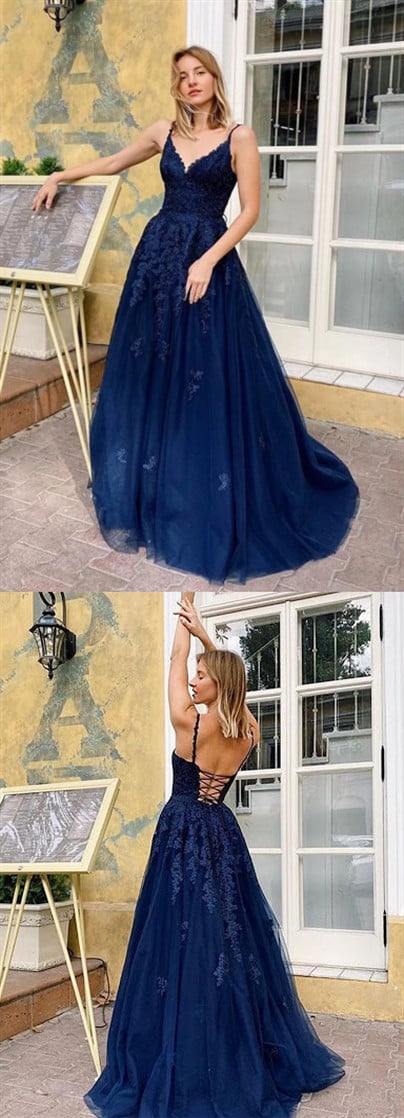 SSR310,blue sleeveless v-neck applique spaghetti-straps backless tulle long evening dresses