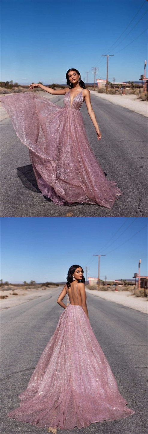 SSR339,pink sleeveless v-neck spaghetti-straps backless sequins evening dress