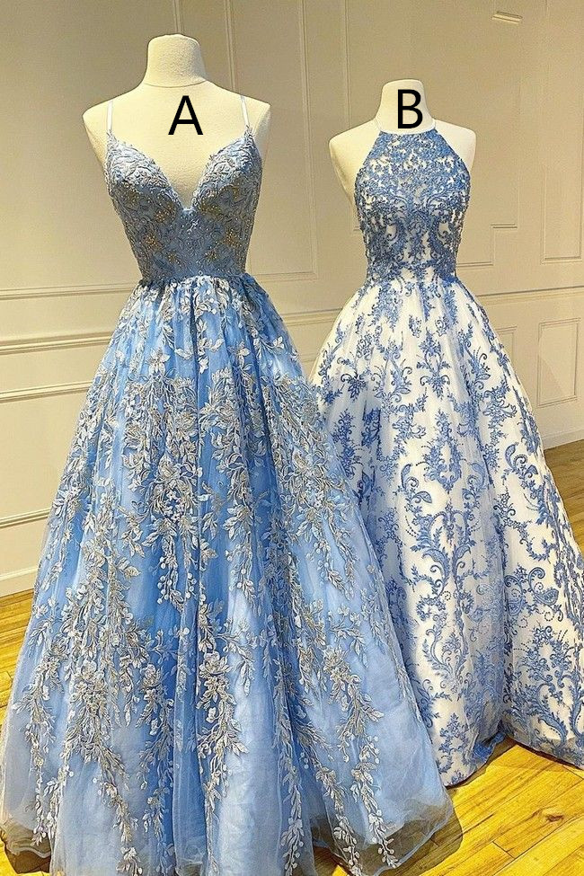 SSR359,blue sleeveless a-line v-neck applique spaghetti-straps long evening dresses