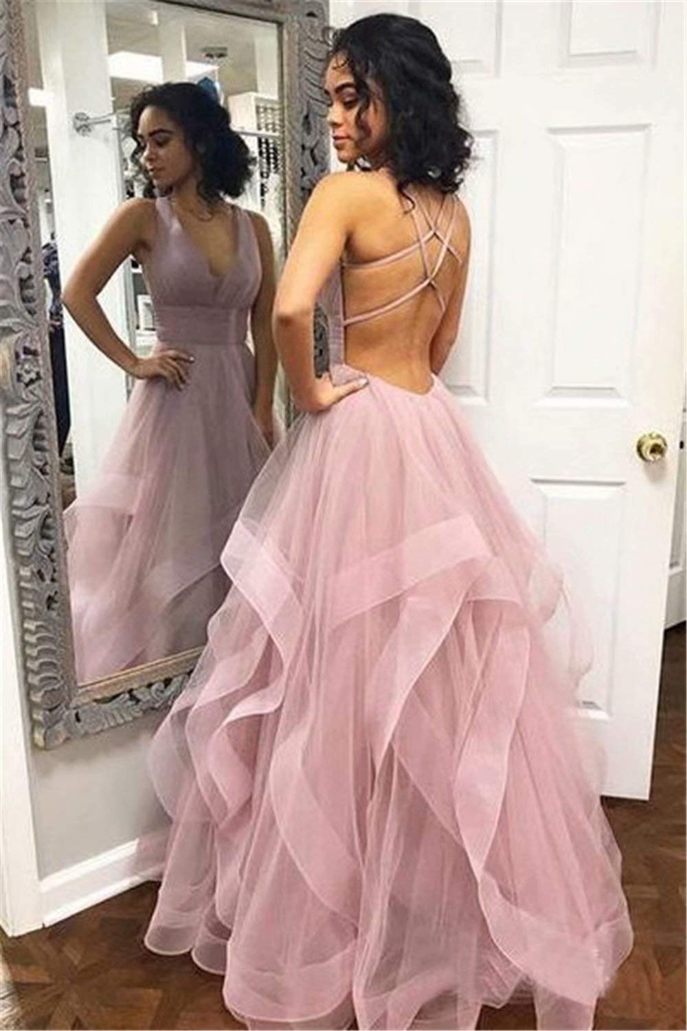 SSR368,pink sleeveles v-neck backelss ruffles tulle evening dress