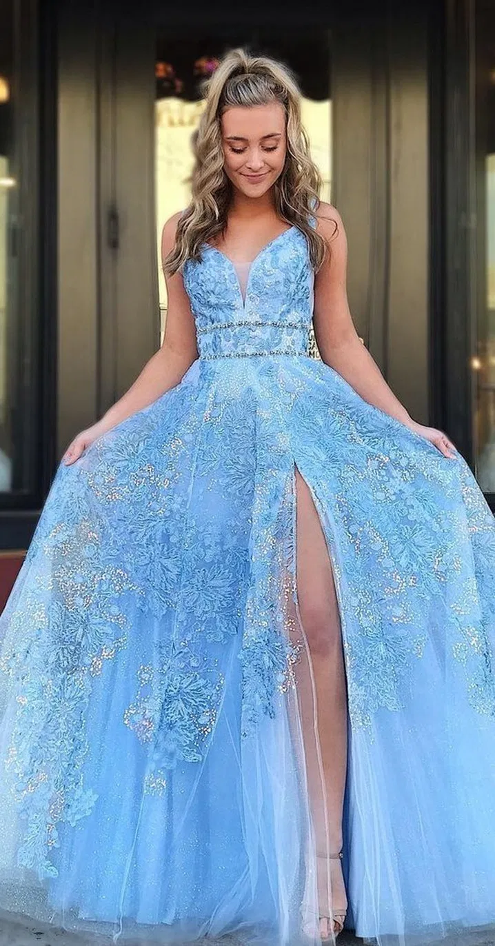 SSR394,blue sleeveless v-neck split spaghetti-straps applique beaded tulle evening dress