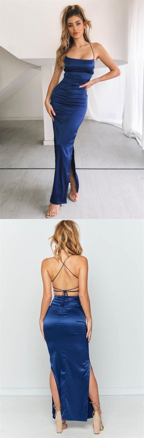 SSR430,blue sleeveless split satin spaghetti-straps backless long evening dress