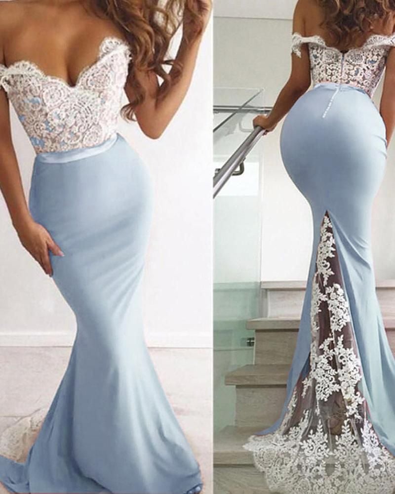 SSR486,blue off shoulder strapless v-neck applique satin lace long evening dress