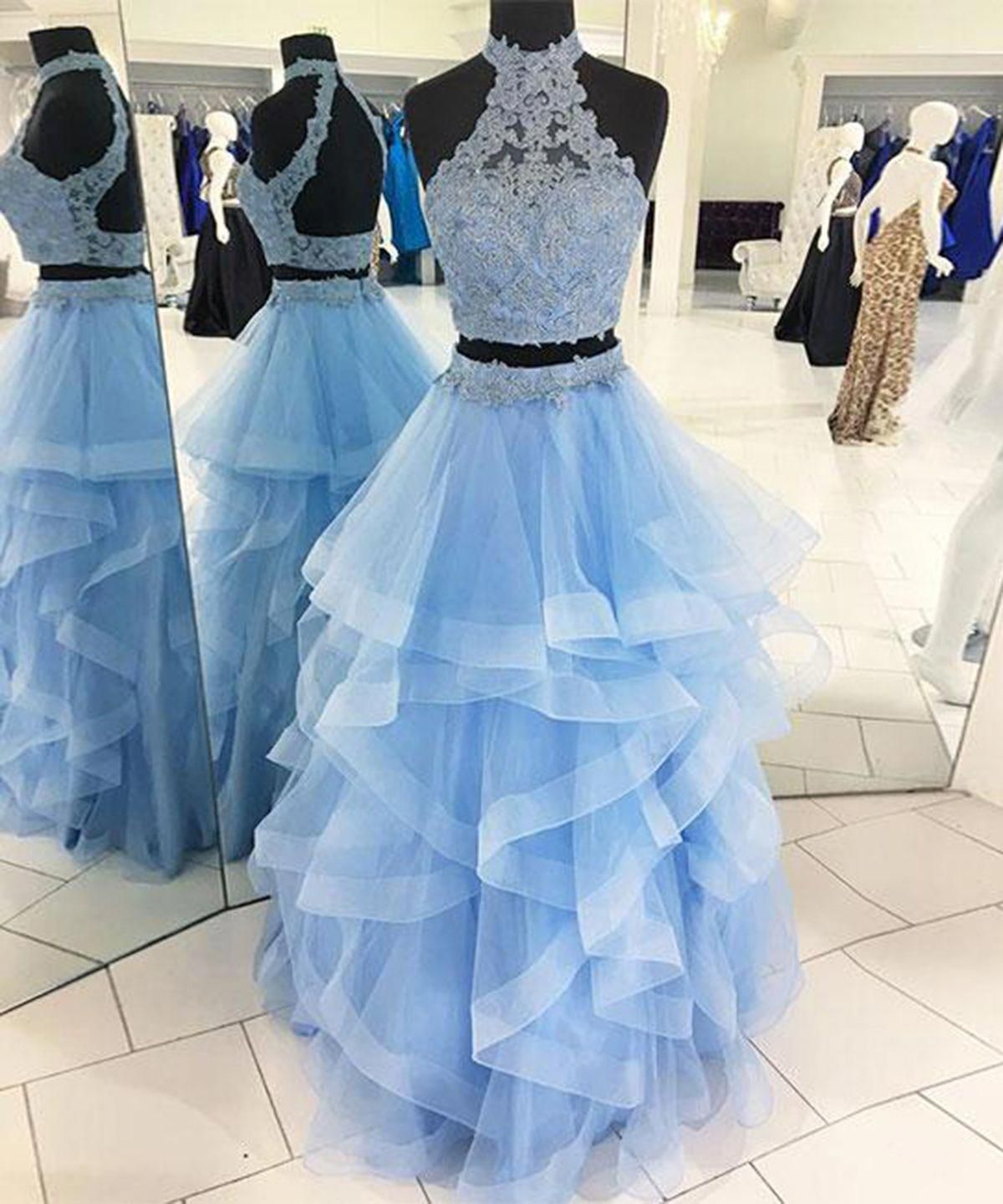 SSR494,blue two piece halter applique sleeveless ruffles tulle evening dresses