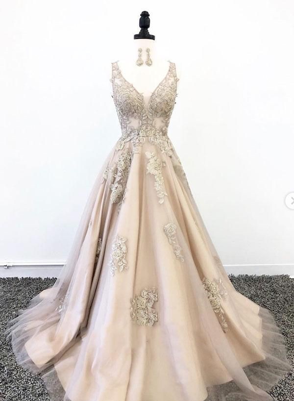 SSR515,v-neck champagne tulle with lace appliques long prom dress