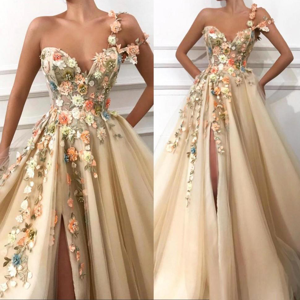 SSR557,champagne one shoulder sweetheart sleeveless applique split beaded tulle evening dresses