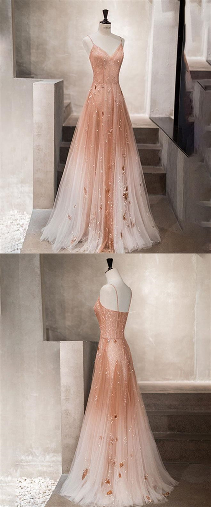 SSR556,pink sleeveless v-neck backless spaghetti straps applique tulle evening dresses