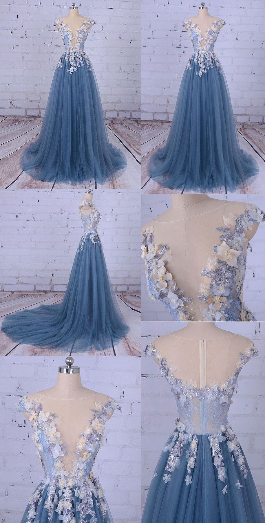 SSR557,blue cap sleeves sheer straps applique beaded long train tulle lace long evening dress