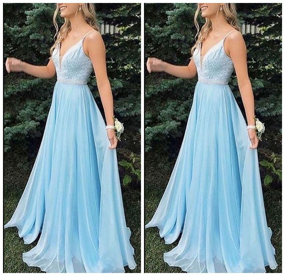 SSR579,charming blue sleeveless v-neck spaghetti-straps beaded split evening dress