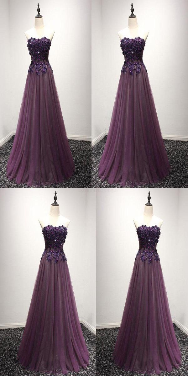 SSR595,purple sleeveless strapless sweetheart applique tulle evening dress
