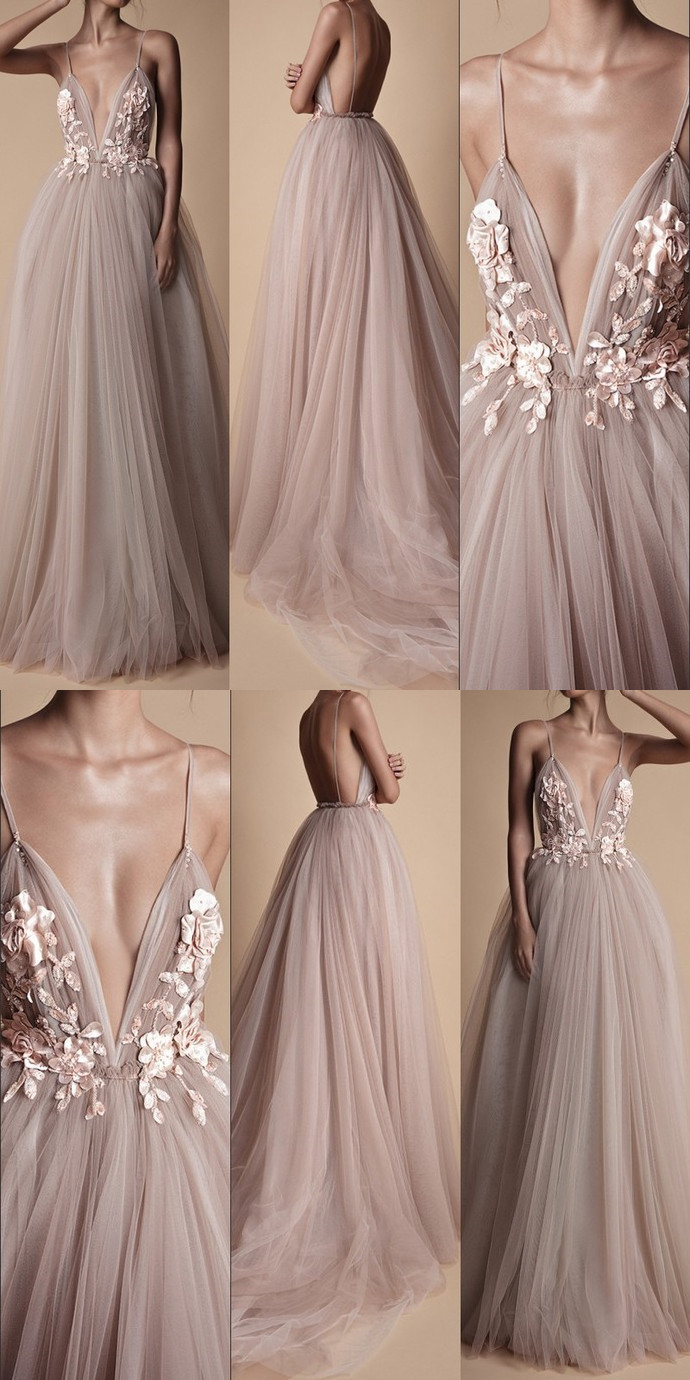 SSR604,sexy sleeveless v-neck backless spaghetti straps applique tulle evening dresses