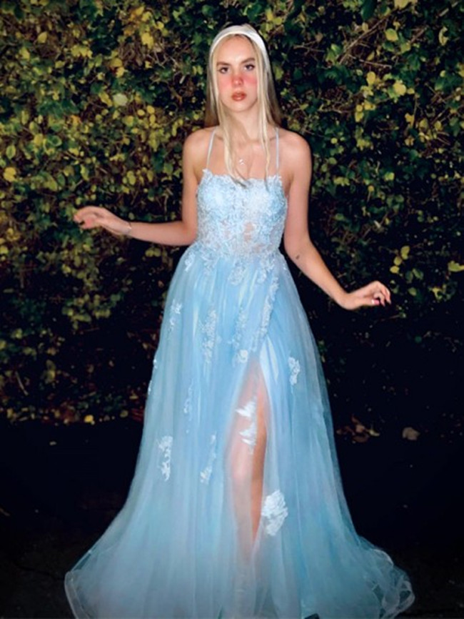 SSR619,Sky blue lace prom dress spaghetti straps tulle prom dresses cross back long evening dress