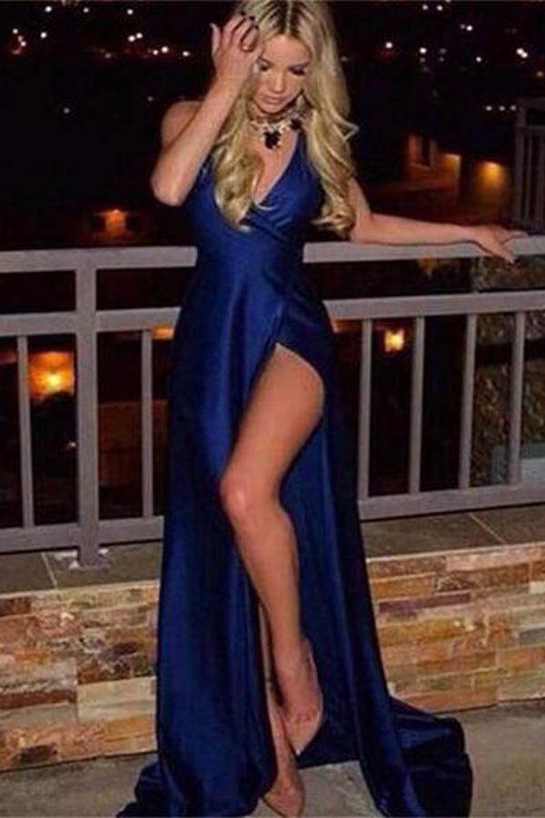 SSR659,Classic Royal Blue Long Prom Dresses,Sexy V-Neck Satin Evening Dresses,Long Party Dance Dresses