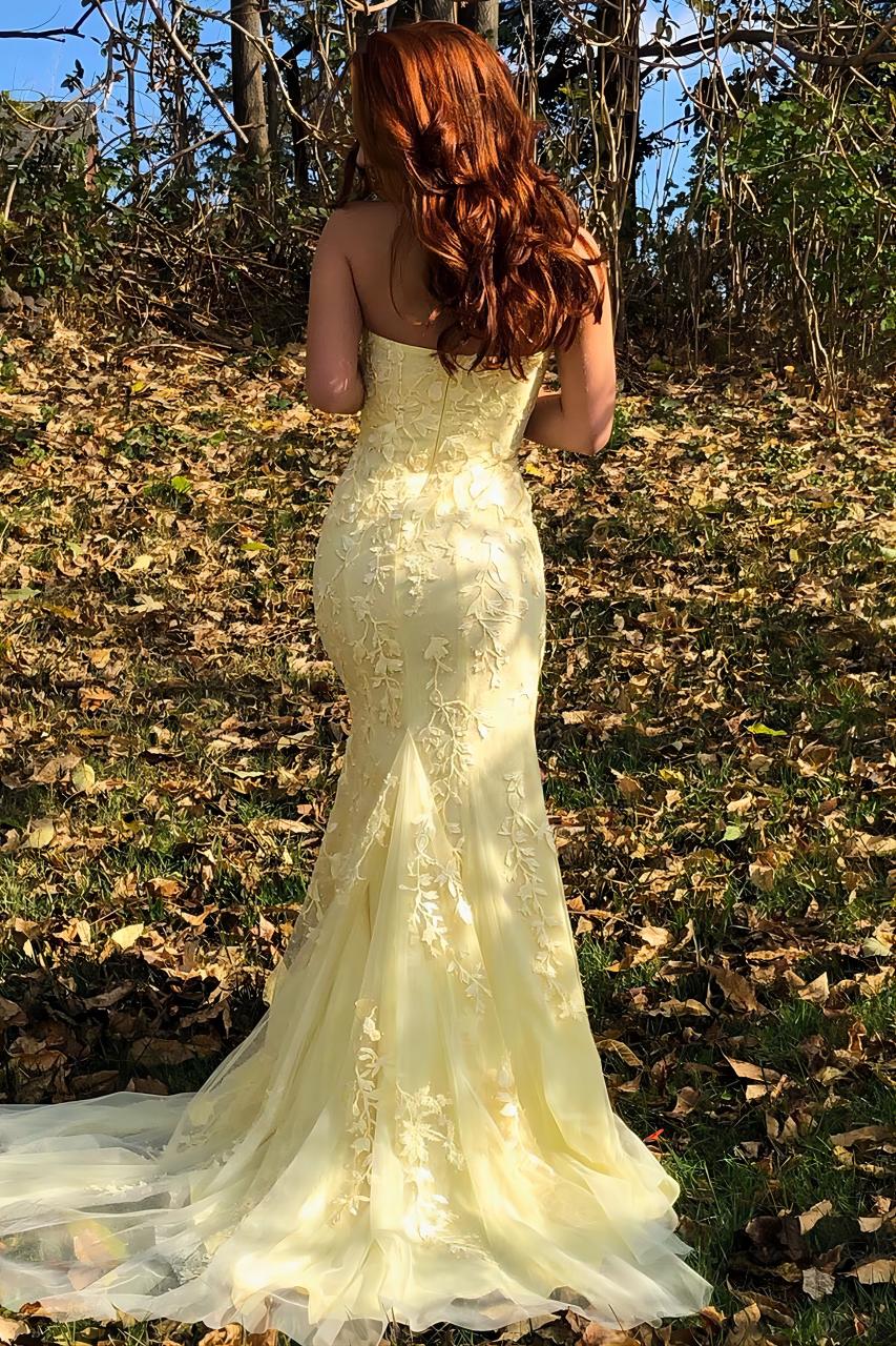 SSR685,Mermaid Strapless Appliques Prom Dresses With Slit,Pastel Yellow Evening Formal Gown
