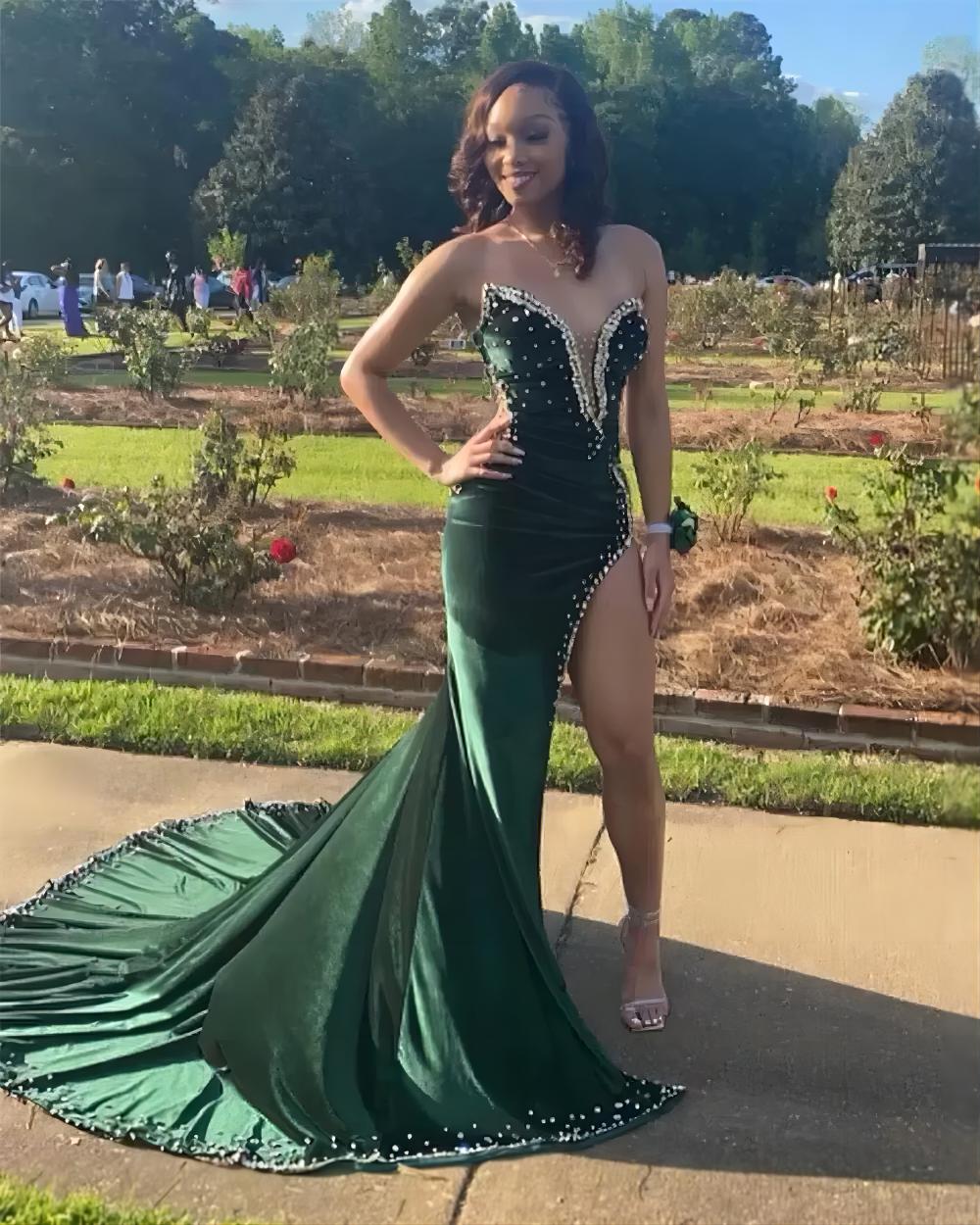 SSR692,Sexy Column Satin Strapless Beading Sleeveless Sweep Train Prom Dresses