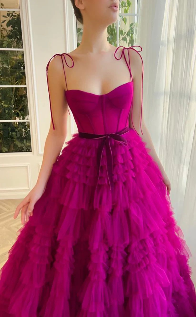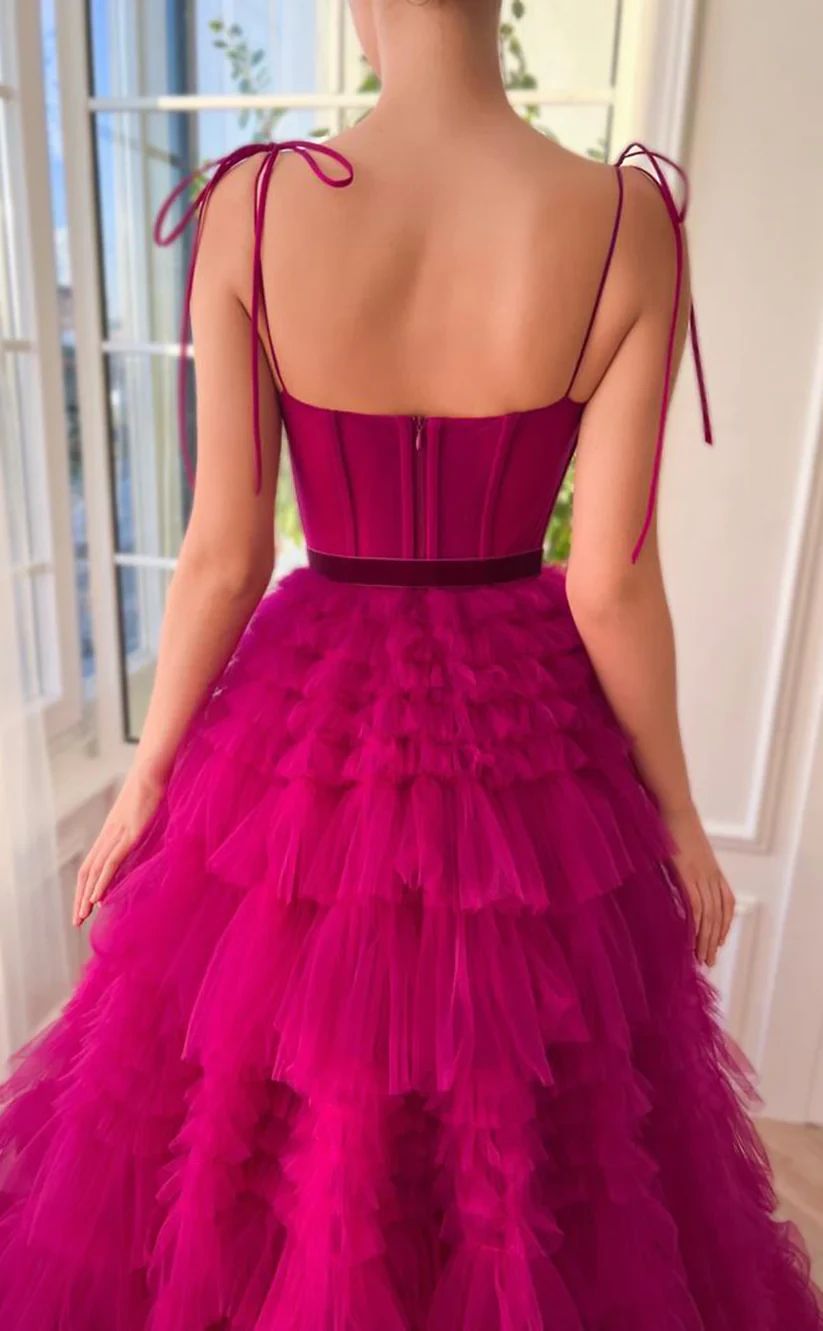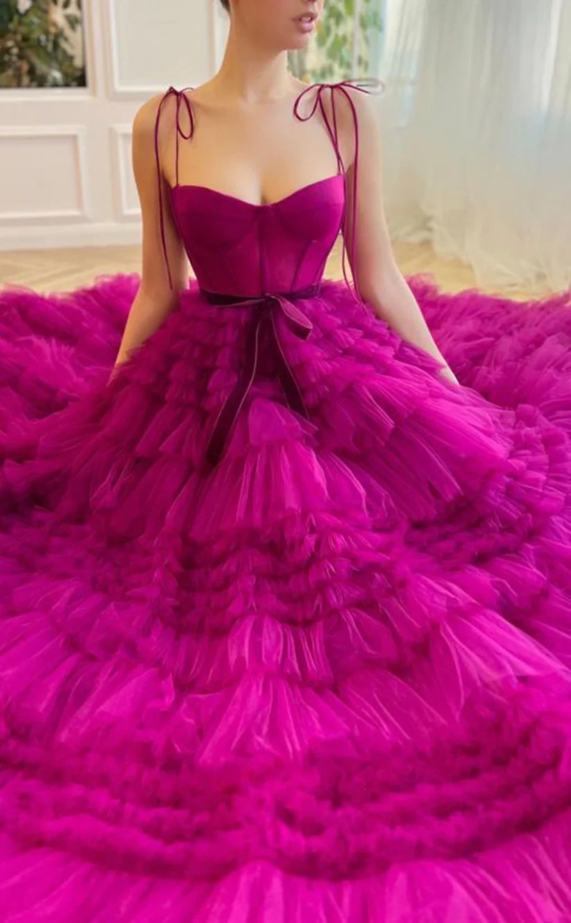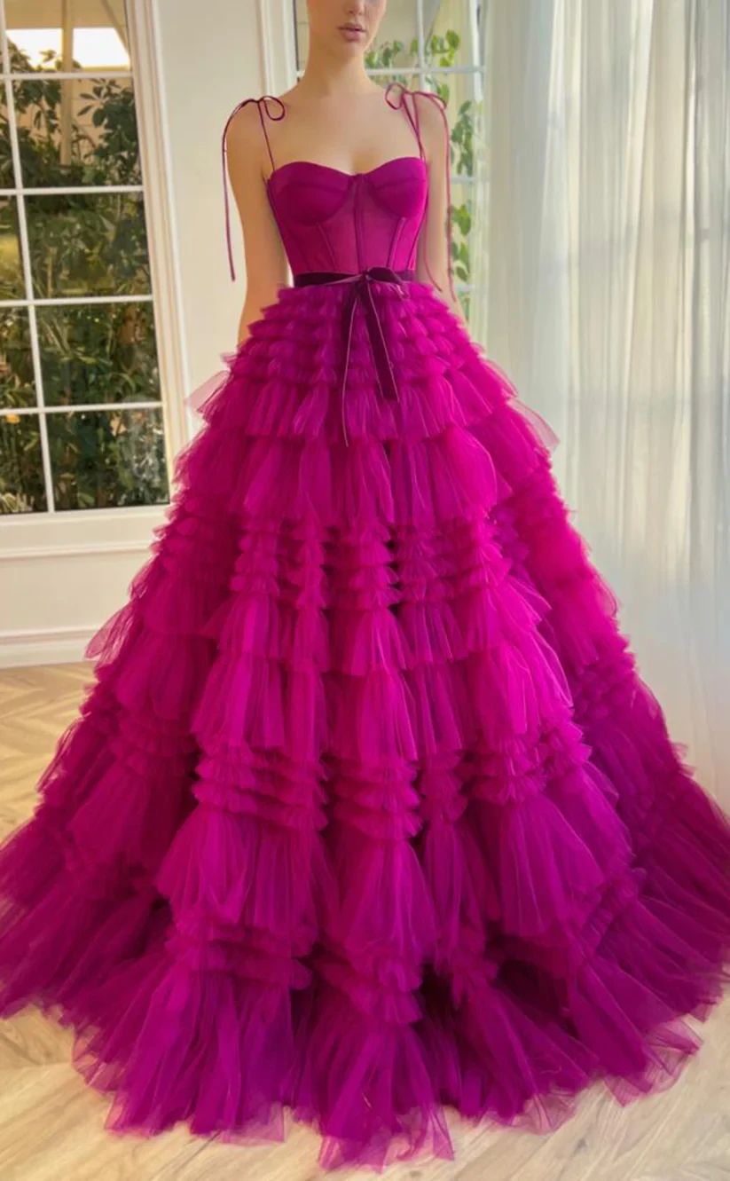 Fuchsia Tulle A-Line Ruffles Prom Evening Dress