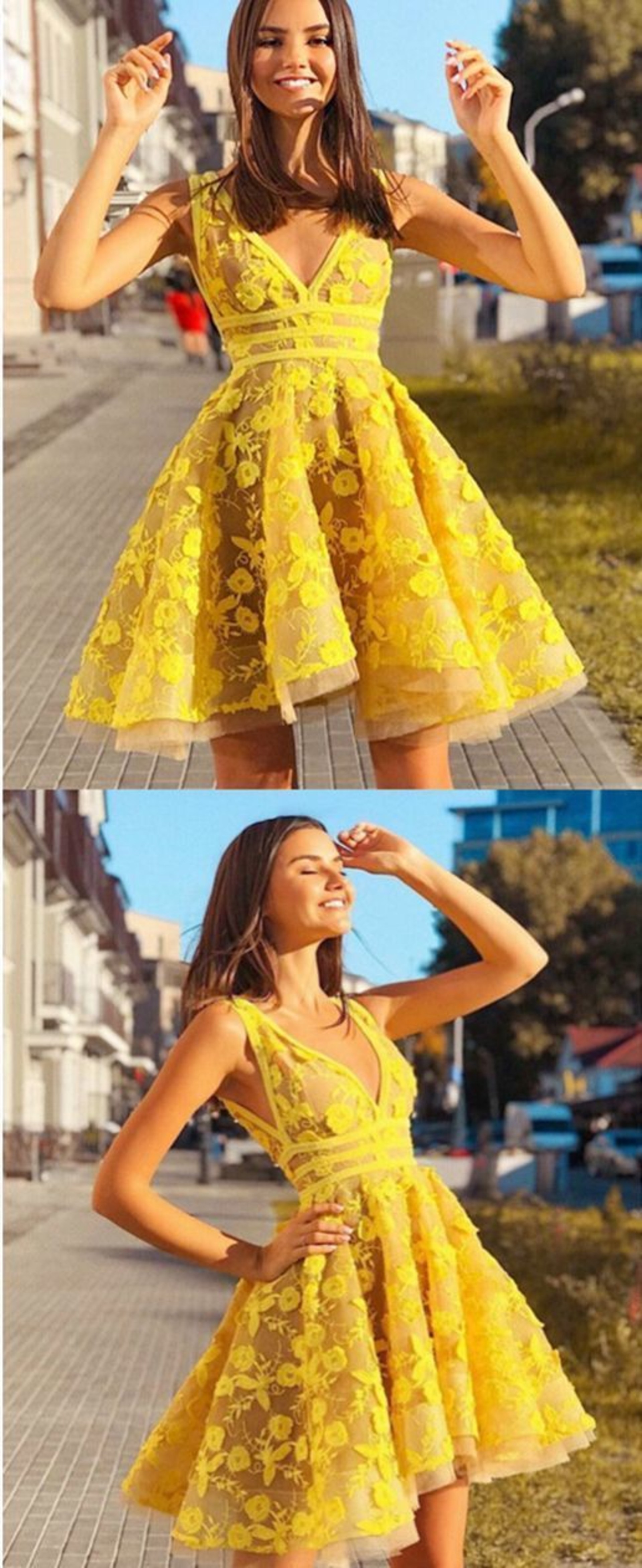 SSR016,yellow sleeveless v-neck applique tulle lace homecoming dress