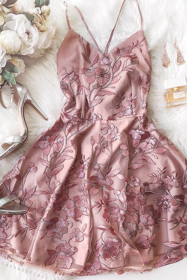 SSR071,pink sleeveless v-neck spaghetti-straps backless applique homecoming dress
