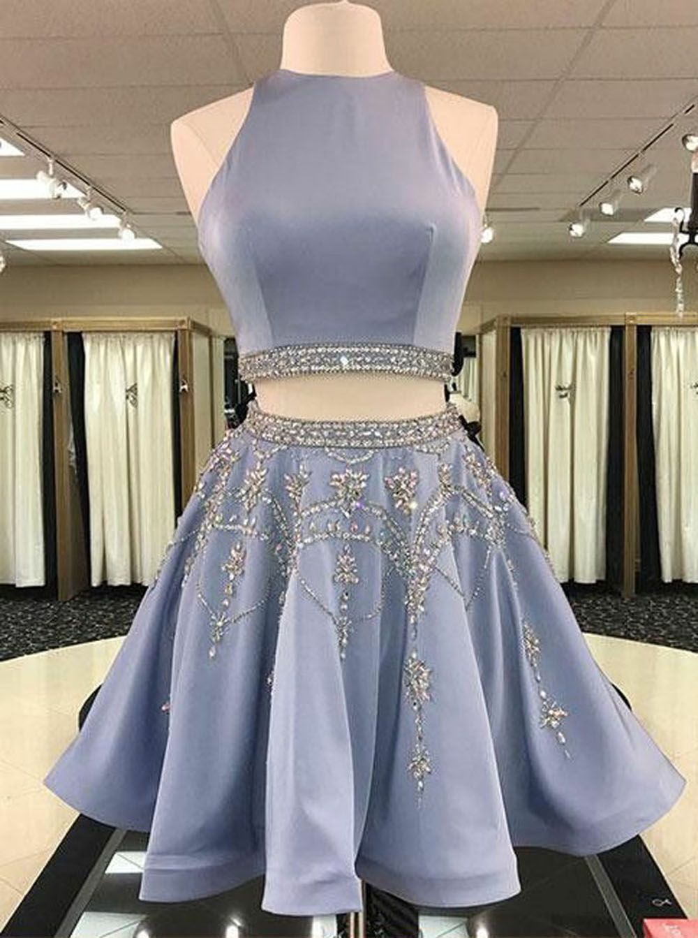 SSR111,two piece purple sleeveless halter beaded satin homecoming dress