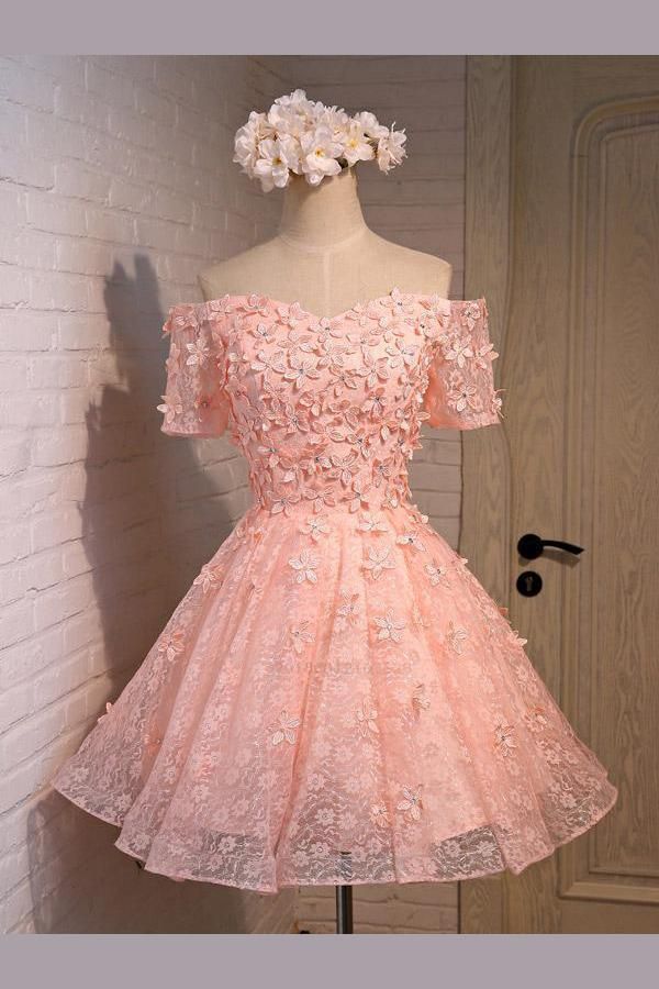 SSR116,pink off the shoulder strapless short sleeves sweetheart applique lace homecoming dress
