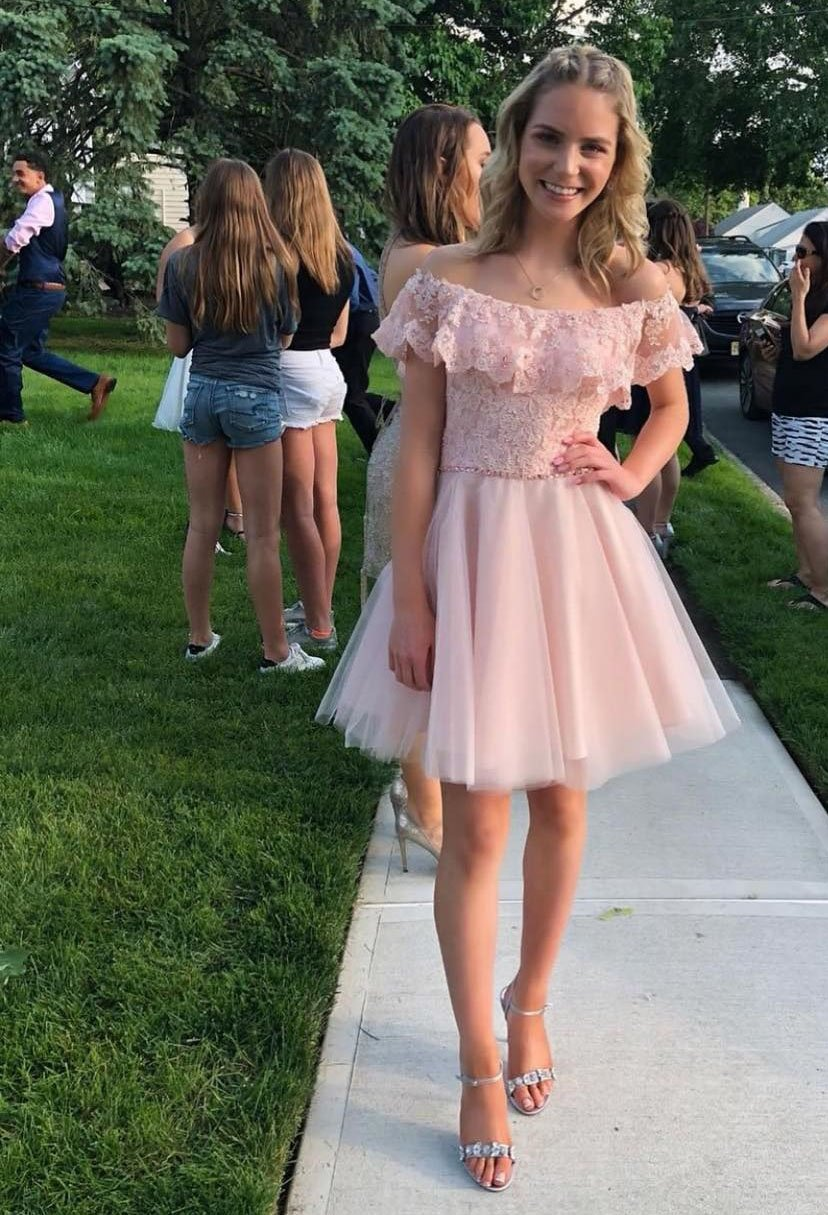 SSR117,pink off the shoulder strapless applique cap sleeves lace tulle homecoming dress