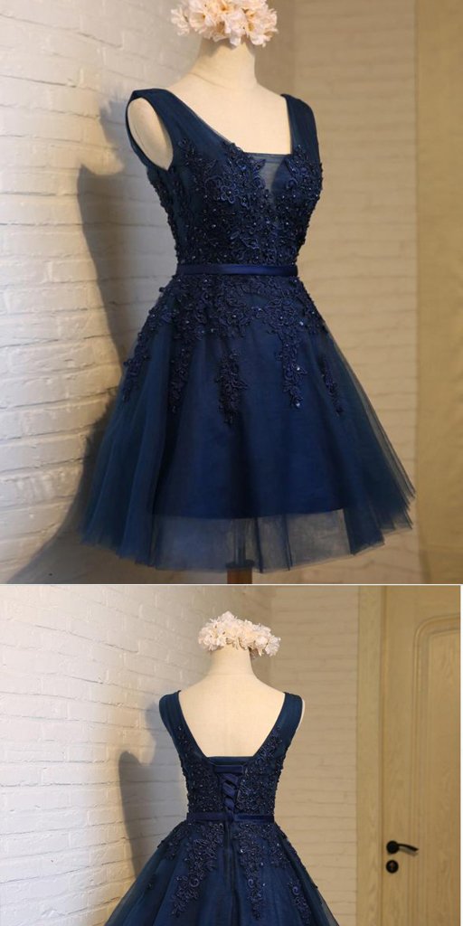 SSR155,blue sleeveless v-neck applique beaded tulle lace homecoming dress