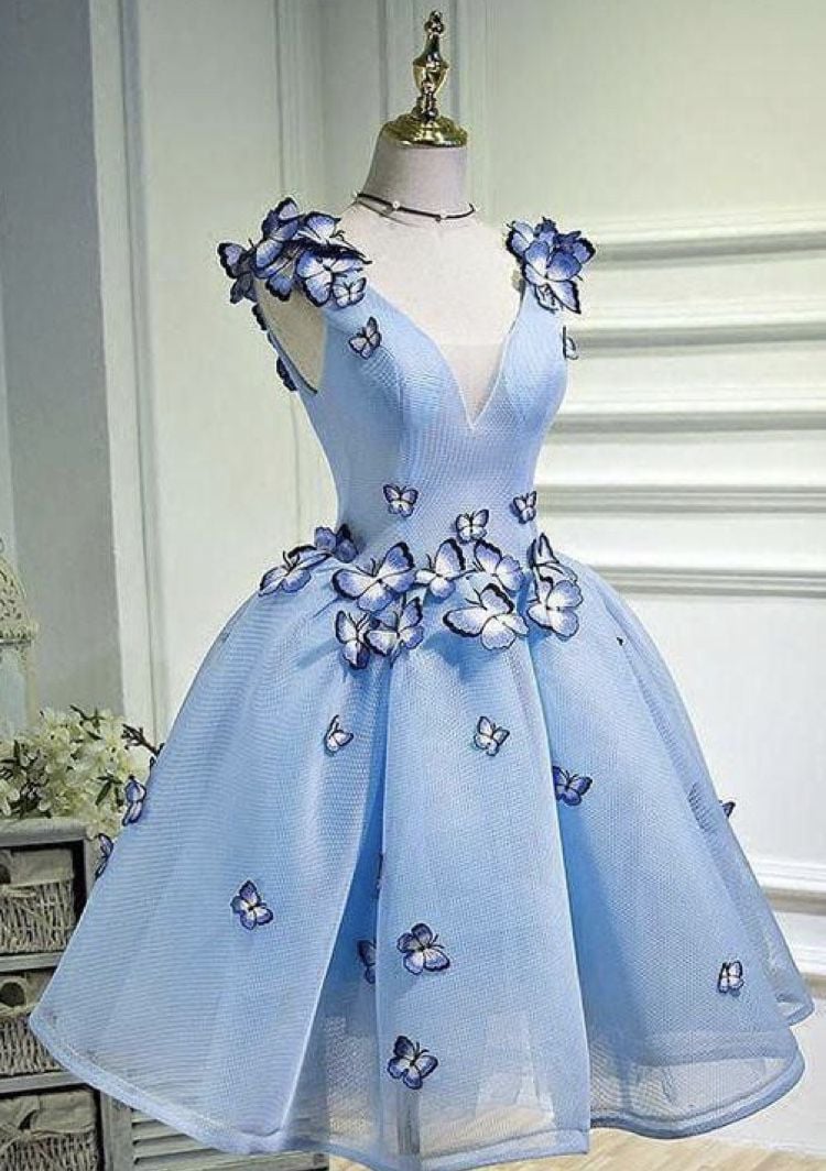 SSR186,blue sleeveless v-neck butterfly tulle school event dress