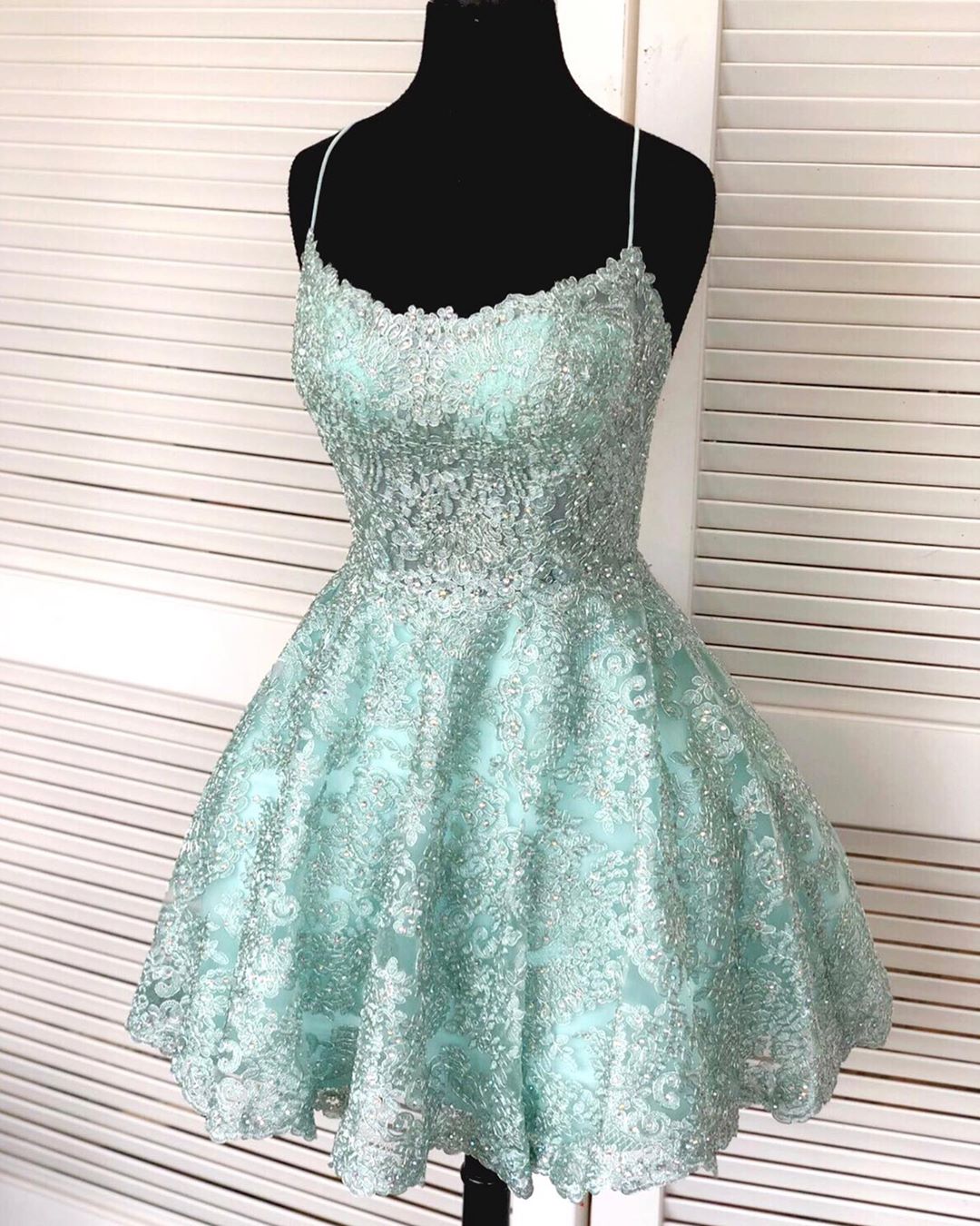 SSR187,green sleeveless v-neck spaghetti-straps applique homecoming dress