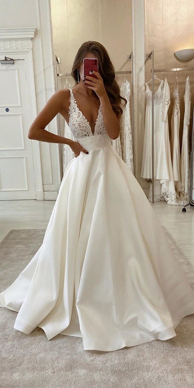 SSR220,A-Line V-neck Lace Appliques Satin Wedding Dress