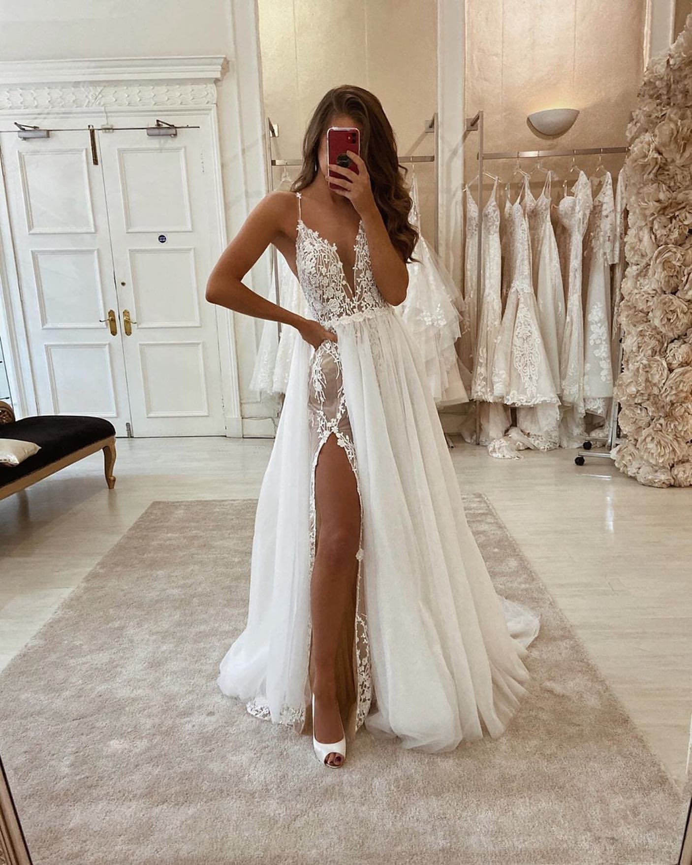 SSR233,light lvory sleeveless v-neck spaghetti-straps slit-skirt applique wedding dress