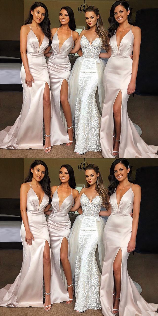 SSR273,simple blush sleeveless v-neck spaghetti-straps slit-skirt bridesmaid dress