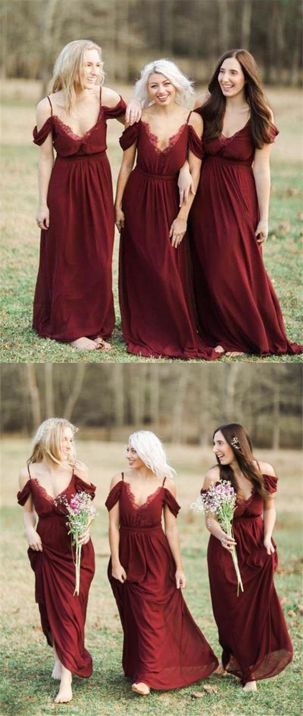 SSR297,burgundy off the shoulder spaghetti-straps v-neck bridesmaid dress