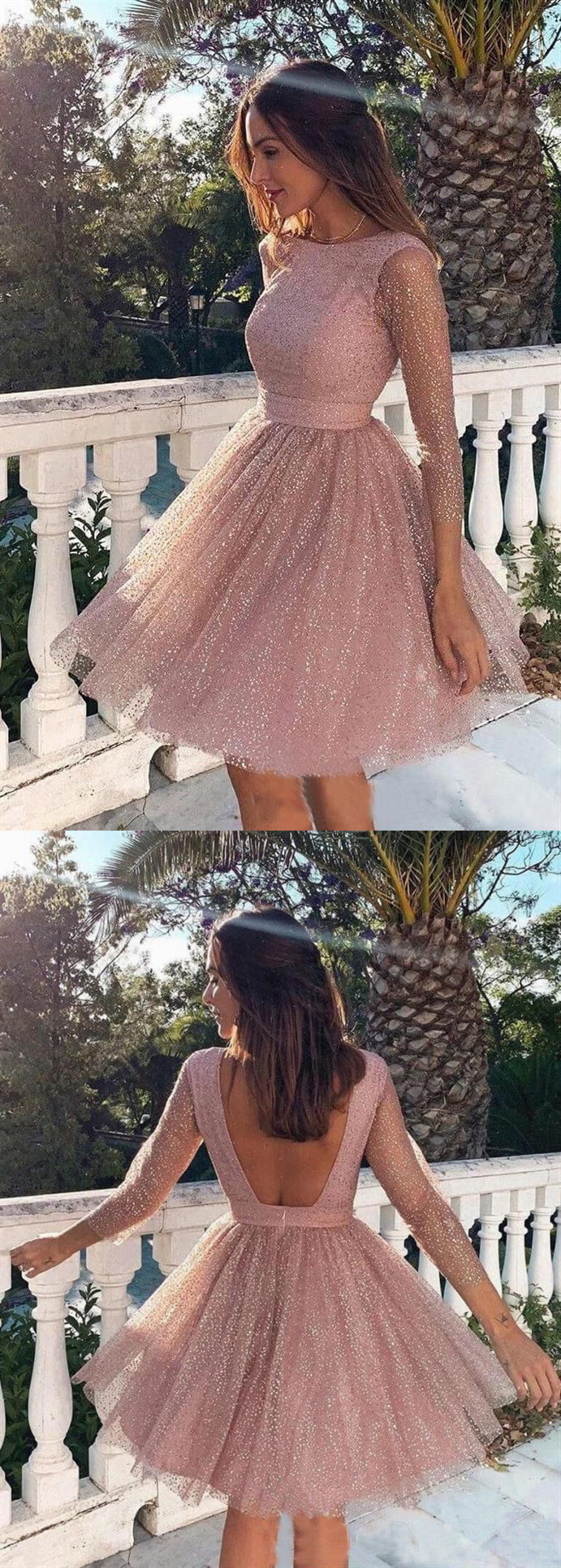 SSR013,short pink long sleeves jewel backless sequins homecoming dresses
