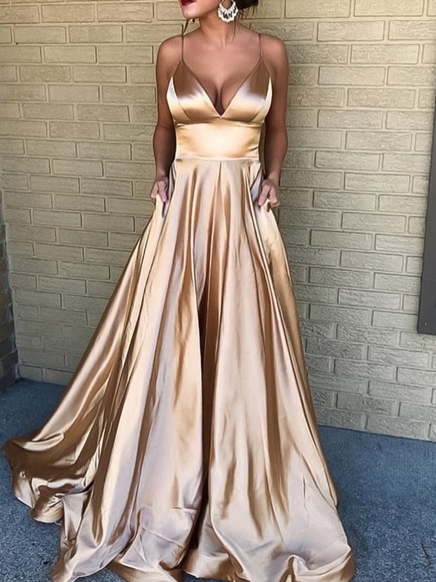 SSR012,Sexy A-Line Ball Gown Spaghetti Straps Prom Dresses V-Neck Evening Gown