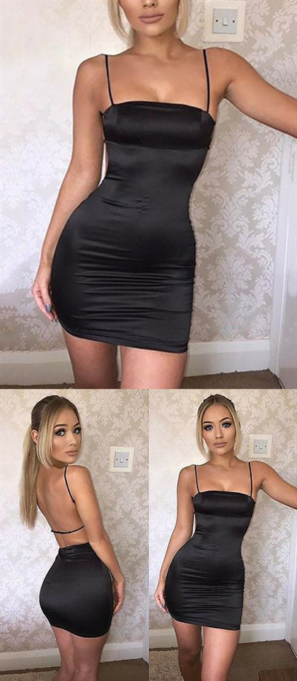 SSR050,simple sexy black sleeveless v-neck spaghetti-straps satin homecoming dress