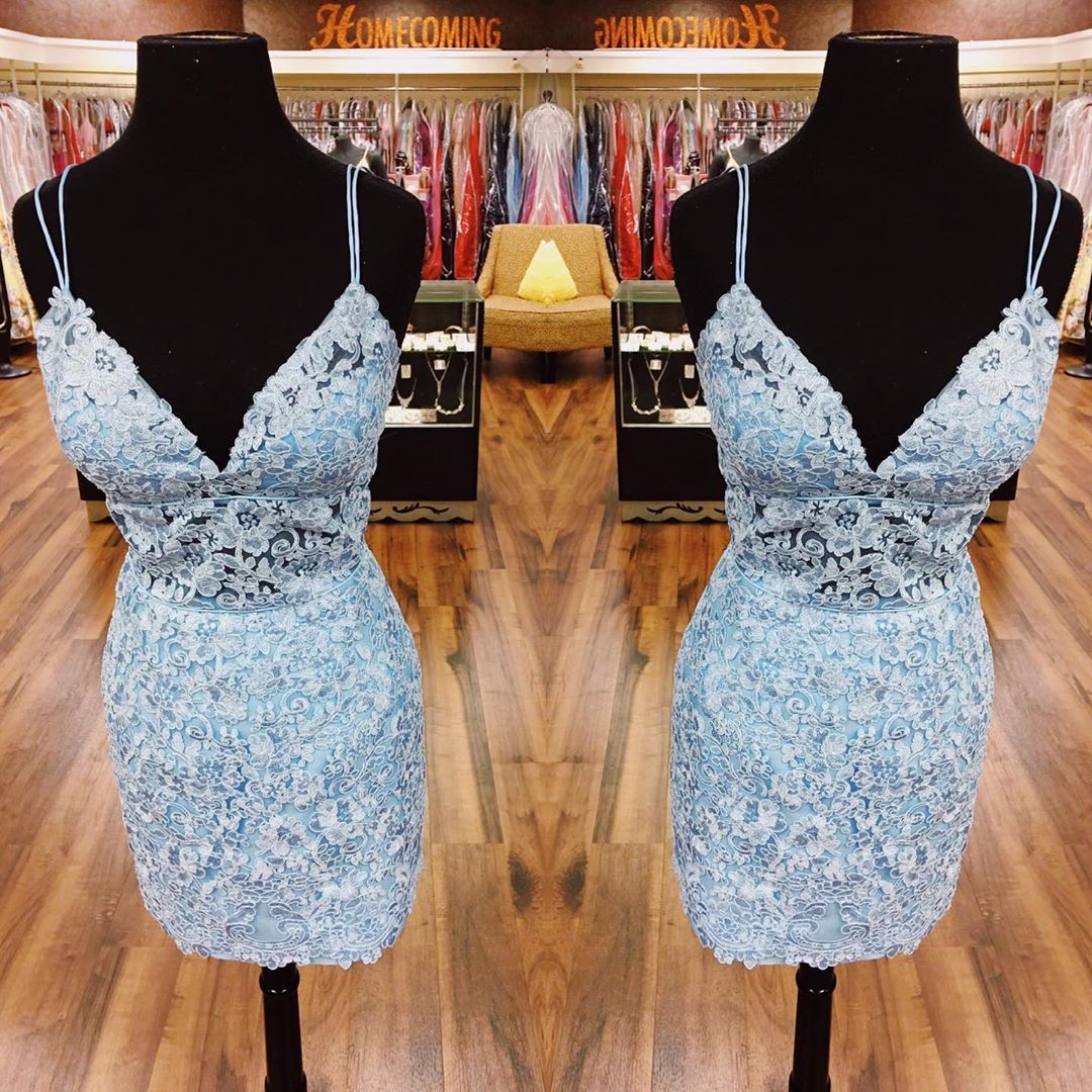 SSR143,blue sleeveless v-neck spaghetti-straps applique homecoming dresses