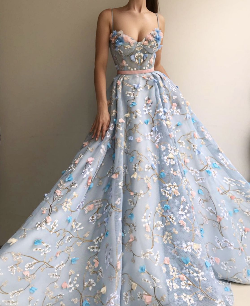 SSR314,blue sleeveless spaghetti-straps sweetheart applique flowers evening dress