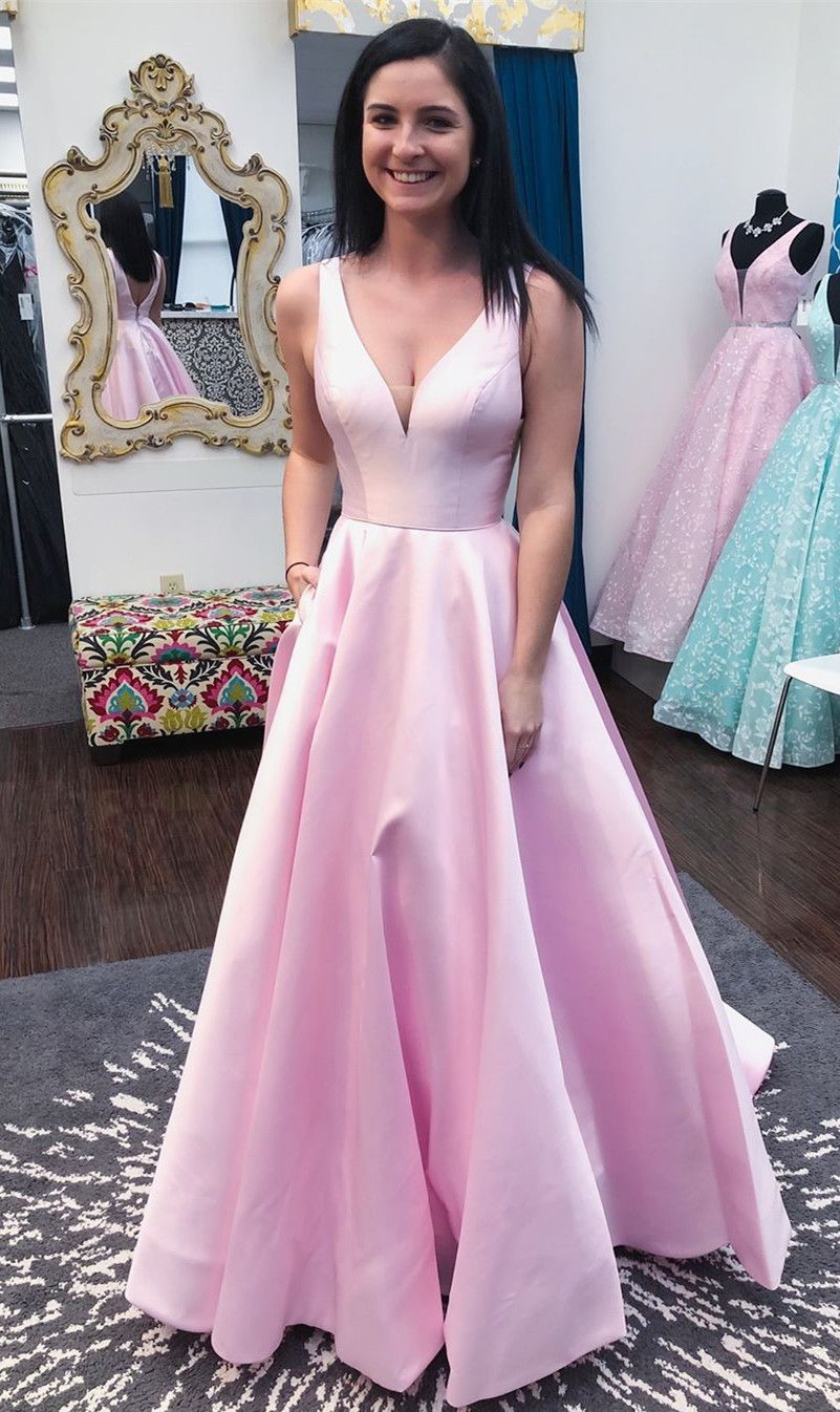 SSR480,simple pink sleeveless v-neck pockets satin long evening dress